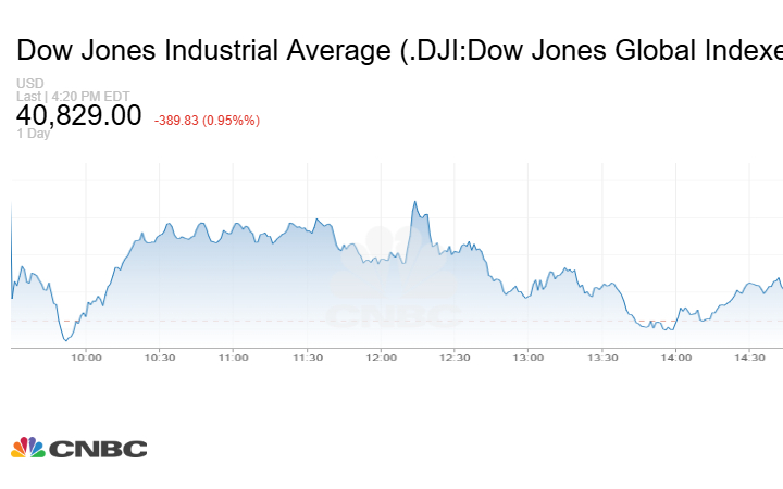 انخفض مؤشر Dow Jones الصناعي 389.83 نقطة أو بنسبة 0.95% عند إغلاق تعاملات الثلاثاء إلى 40829 نقطة.