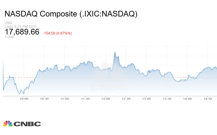 أيضاً تراجع مؤشر Nasdaq المركب عند الإغلاق بنحو 154.58 نقطة أو بنسبة 0.87% إلى 17689.66 نقطة.