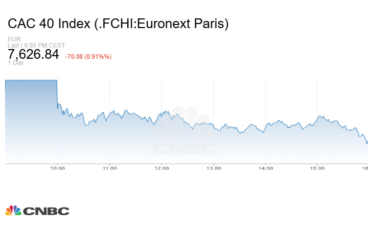 في حين هبط مؤشر CAC 40 الفرنسي بنحو 70.08 نقطة أو بنسبة 0.91% عند الإغلاق إلى مستوى 7626.84 نقطة.