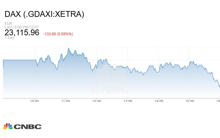 كما أغلق مؤشر DAX الألماني الجلسة على هبوط 133.69 نقطة أو بنسبة 0.58% إلى مستوى 23115.96 نقطة.
