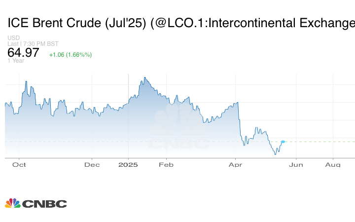صعدت العقود الآجلة لخام برنت بنسبة 1.58% أو ما يعادل 1.01 دولاراً لتسجّل عند التسوية 64.93 دولاراً للبرميل.