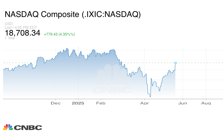 وقفزمؤشر ناسداك المركب بنسبة 4.35%، حيث دفعت الاتفاقية الأولية مع الصين أسهم التكنولوجيا المرتبطة بها، مثل تسلا وآبل، إلى الارتفاع. وكان هذا أفضل يوم منذ 9 أبريل لجميع المؤشرات الثلاثة.