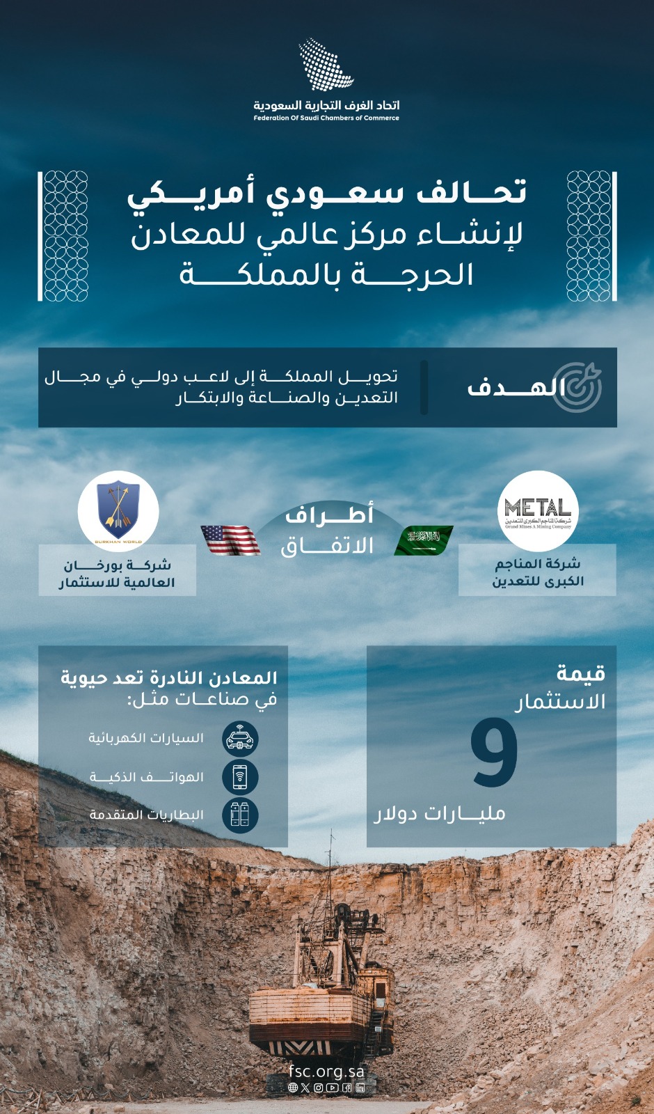 وقعت شركة المناجم الكبرى للتعدين السعودية مذكرة تفاهم مع شركة بورخان العالمية للاستثمار الأميركية لإنشاء أكبر مركز للمعادن الحرجة بالعالم في المملكة بقيمة استثمارات تقدر بنحو تسعة مليارات دولار، بحسب ما ذكره رئيس اللجنة الوطنية للتعدين في اتحاد الغرف السعودية، محمد بن ناصر آل دليم.
