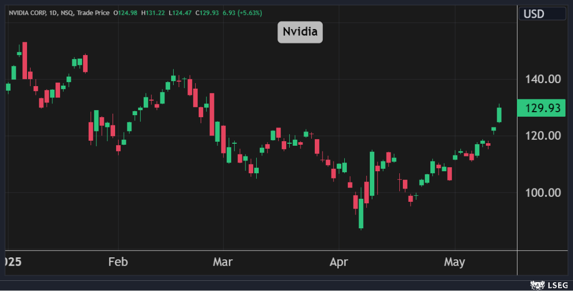قفز سهم Nvidia بنسبة 5.6% في جلسة الثلاثاء إلى أعلى مستوياته في أكثر من شهرين، لتضيف الشركة نحو 170 مليار دولار إلى قيمتها السوقية في يوم واحد.