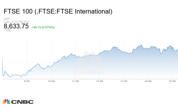 وزاد مؤشر FTSE 100 البريطاني 48.74 نقطة أو بنسبة 0.57% عند الإغلاق إلى مستوى 8633.75 نقطة.