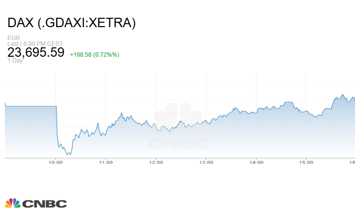 كما أغلق مؤشر DAX الألماني الجلسة على صعود 168.58 نقطة أو بنسبة 0.72% إلى مستوى 23695.59 نقطة، على الرغم من تباين أداء بعض أسهمه الرئيسية.