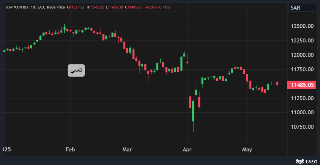 تراجع مؤشر تاسي بنسبة 0.4% في جلسة الخميس ليسجل ثاني خسارة يومية على التوالي بضغط من انخفاض سهمي الراجحي وstc بنسبة 0.5% و0.6% على التوالي.
