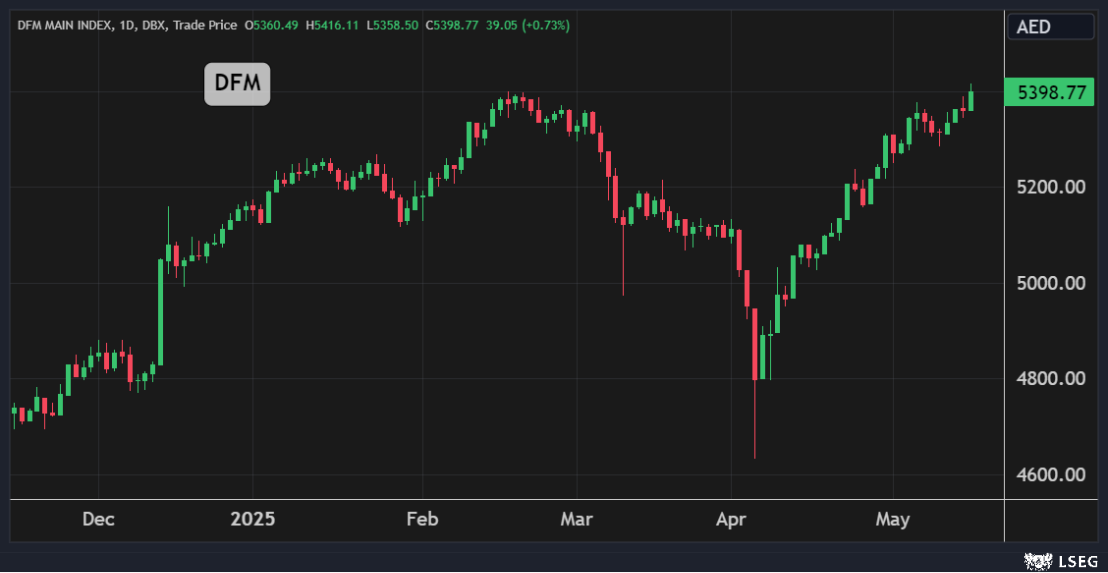 كما ارتفع مؤشر سوق دبي بنسبة 0.7% محققاً أعلى إغلاق يومي له في نحو 17 عاماُ متأثراً بدعم من ارتفاع سهم الإمارات دبي الوطني بنسبة 3%.