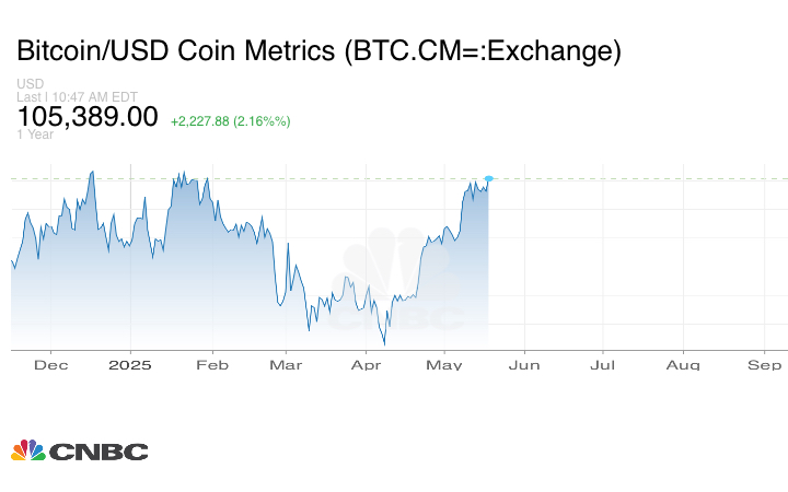 قفز سعر رائدة العملات المشفرة البتكوين بنحو 2.27% إلى 105.509.00 دولار ، الأحد 18 مايو/ أيار، مدعومة بحالة من التفاؤل الحذر في سوق الكريبتو، على خلفية الاتفاق التجاري بين الولايات المتحدة والصين، مما عزز شهية المستثمرين للأصول عالية المخاطر، وفي مقدمتها العملات الرقمية.