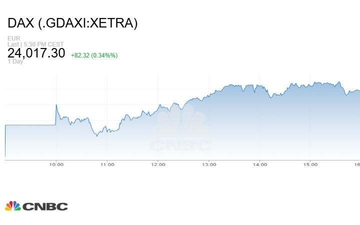 كما أغلق مؤشر DAX الألماني الجلسة على صعود 82.32 نقطة أو بنسبة 0.34% إلى مستوى 24017.30 نقطة.