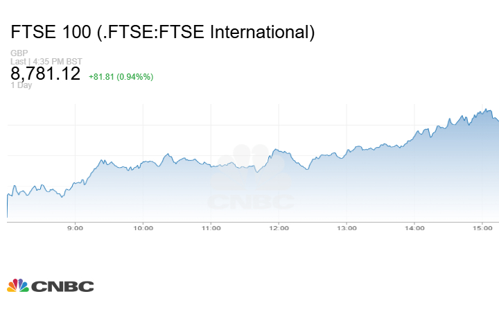 وزاد مؤشر FTSE 100 البريطاني 81.81 نقطة أو بنسبة 0.94% عند الإغلاق إلى مستوى 8781.12 نقطة.\
