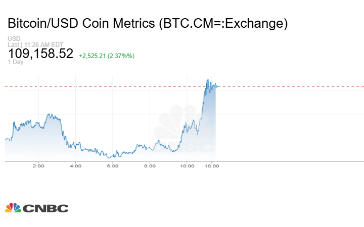 وفي أحدث تعاملات، ارتفعت أسعار عملة بتكوين المشفرة بأكثر من 2% إلى مستوى يتجاوز 109 آلاف دولار، وفقًا لمنصة كوين ميتريكس. وذلك بعد أن وصلت في وقت سابق من تعاملات اليوم إلى 109500 دولار.