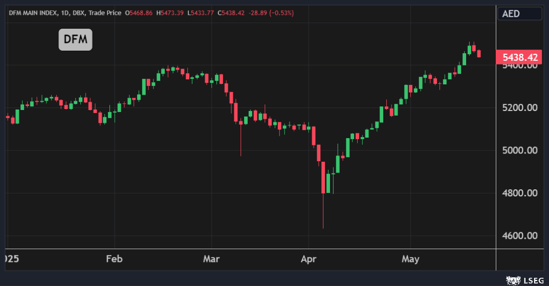 كما تراجع مؤشر سوق دبي بنسبة 0.5% مسجلاً ثاني خسارة يومية على التوالي بضغط من انخفاض سهمي الإمارات دبي الوطني وسالك بنسبة 2.6% و1.6% على التوالي.