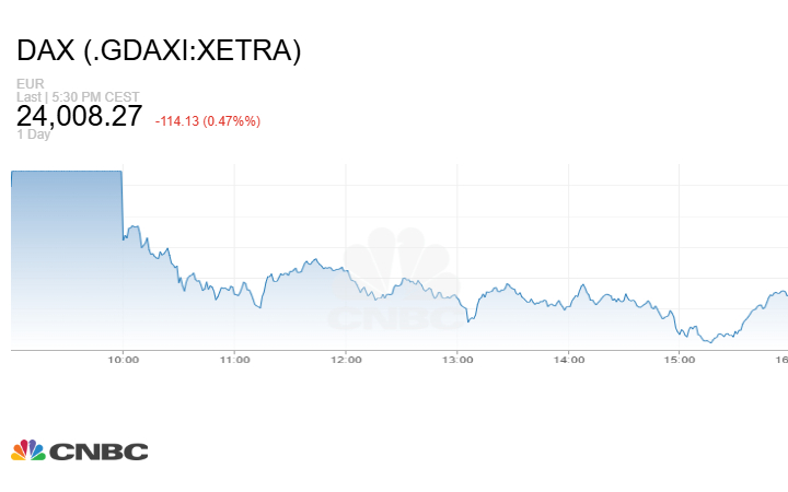 كما أغلق مؤشر DAX الألماني الجلسة على هبوط 114.13 نقطة أو بنسبة 0.47% إلى مستوى 24008.27 نقطة.