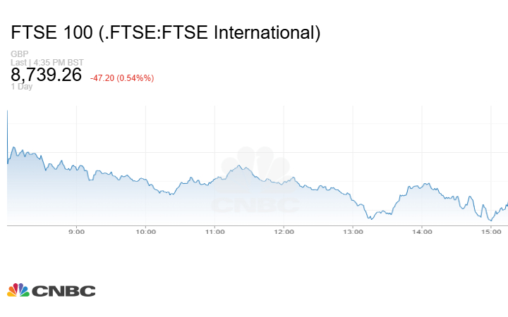 وتراجع مؤشر FTSE 100 البريطاني 47.20 نقطة أو بنسبة 0.54% عند الإغلاق إلى مستوى 8739.26 نقطة.
