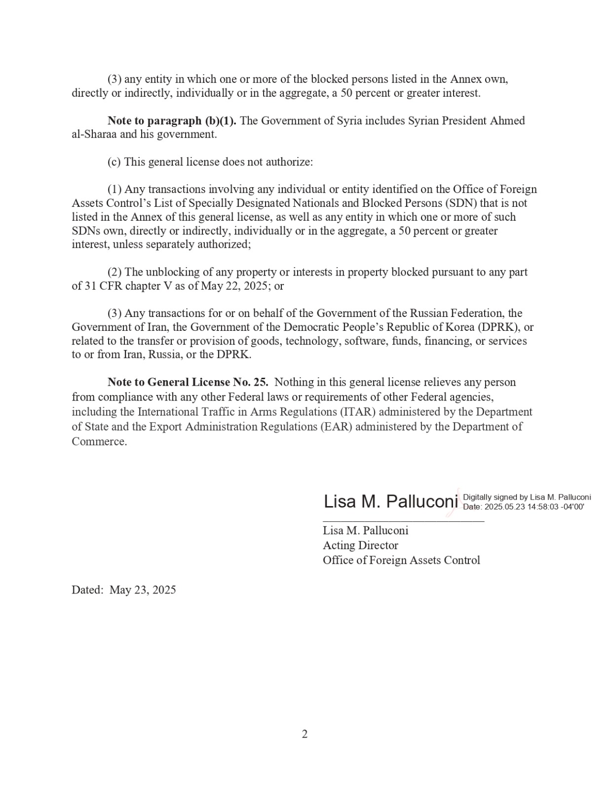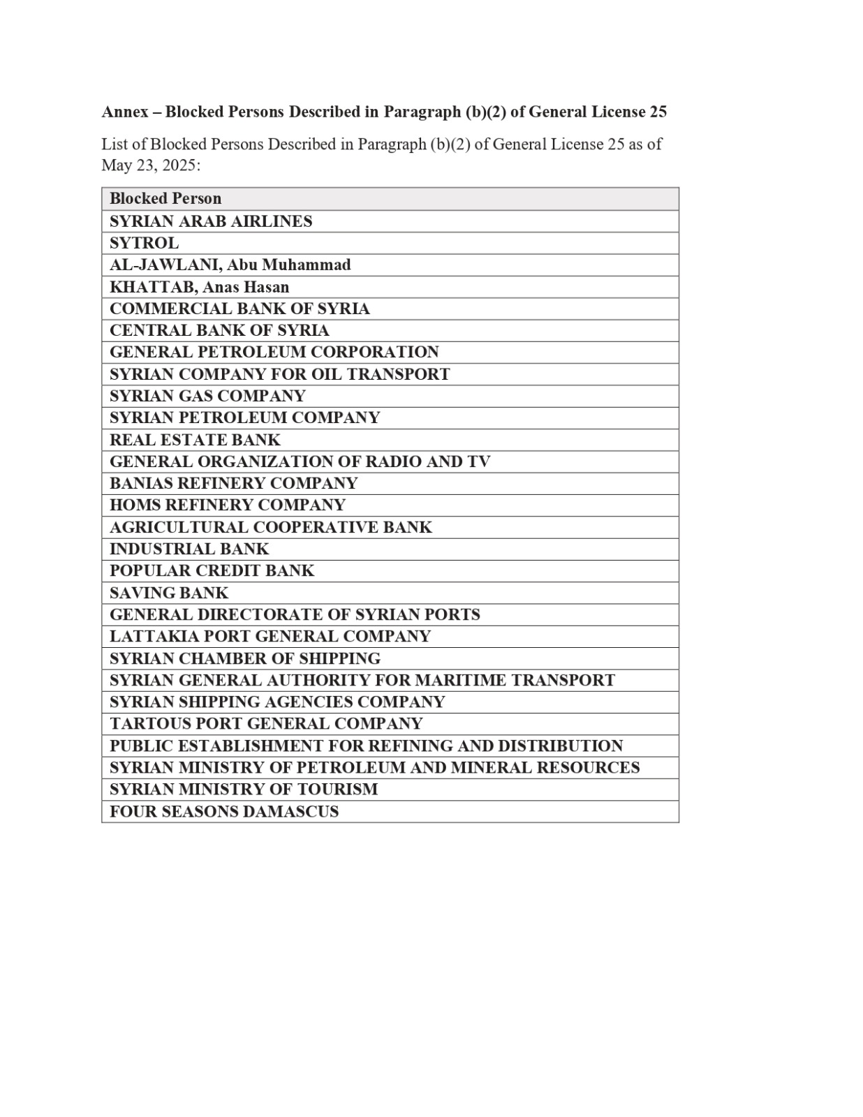 كما يجيز GL 25 جميع المعاملات مع الحكومة السورية الجديدة، ومع بعض الأشخاص المحظورين المحددين في ملحق GL. وتماشياً مع القرار GL، تقدم شبكة إنفاذ الجرائم المالية (FinCEN) إعفاءً استثنائياً للسماح للمؤسسات المالية الأميركية بالاحتفاظ بحسابات مراسلة للبنك التجاري السوري.
