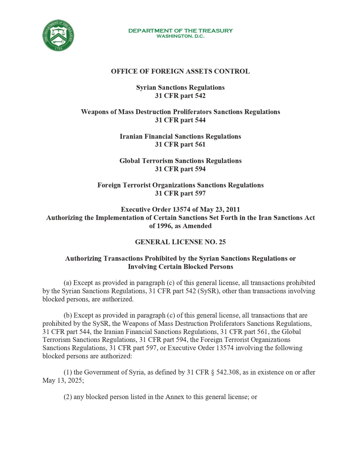 يُجيز الترخيص العام رقم 25 المعاملات المحظورة بموجب لوائح العقوبات المفروضة على سوريا، مما يرفع العقوبات عنها فعليًا. وسيُتيح الترخيص العام رقم 25 فرص استثمارية جديدة وأنشطة في القطاع الخاص، بما يتماشى مع استراتيجية الرئيس "أميركا أولًا". ويُمثل هذا جزءاً واحداً فقط من جهد حكومي أميركي أوسع نطاقاً لرفع كامل هيكل العقوبات المفروضة على سوريا بسبب انتهاكات نظام بشار الأسد.