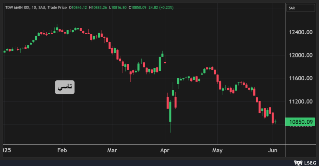 وكان المؤشر السعودي قد انخفض بنسبة 5.8% في مايو ليتكبد رابع خسارة شهرية على التوالي وأكبر خسارة شهرية منذ عام كامل.