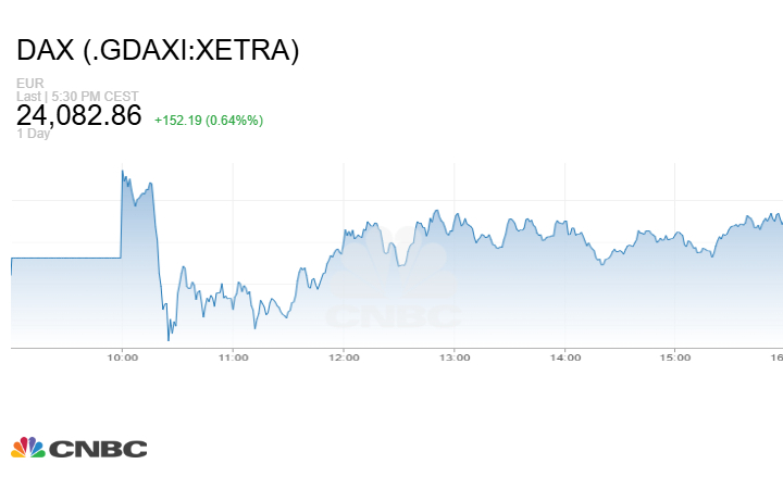 كما أغلق مؤشر DAX الألماني الجلسة على صعود 152.19 نقطة أو بنسبة 0.64% إلى مستوى 24082.86 نقطة.