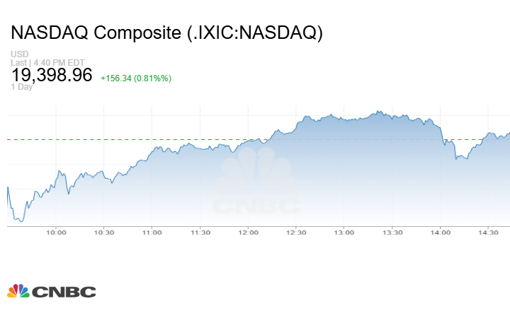 وزاد مؤشر Nasdaq المركب عند الإغلاق بنحو 156.34 نقطة أو بنسبة 0.81% إلى 19398.96 نقطة.