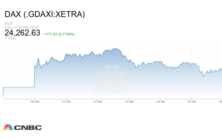 كما أغلق مؤشر DAX الألماني الجلسة على صعود 171.01 نقطة أو بنسبة 0.71% إلى مستوى 24262.63 نقطة.