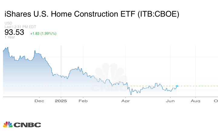 قفز صندوق iShares الأميركي لبناء المنازل (ITB) بأكثر من 2% في تداولات منتصف النهار. وإذا استمر هذا الارتفاع حتى نهاية الجلسة، فسيكون أكبر مكسب يومي للصندوق منذ 12 مايو، عندما ارتفع بأكثر من 4%.