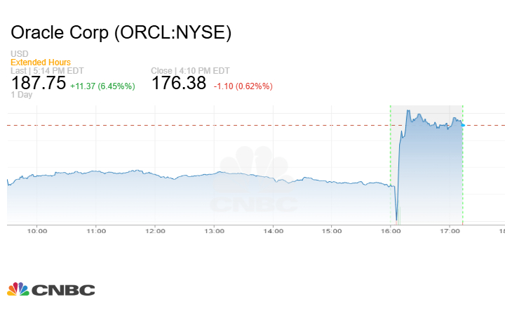 ارتفعت أسهم شركة أوراكل Oracle بنحو 6.5% في تعاملات ما بعد جلسة تداول يوم الأربعاء 11 يونيو/ حزيران، وذلك بعد أن أعلنت شركة البرمجيات عن نتائج أعمال فصيلة فاقت توقعات وول ستريت، مشيرةً إلى تسارع نمو الحوسبة السحابية.