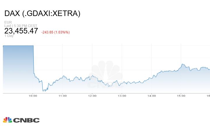 كما أغلق مؤشر DAX الألماني الجلسة على هبوط 243.65 نقطة أو بنسبة 1.03% إلى مستوى 23455.47 نقطة.
