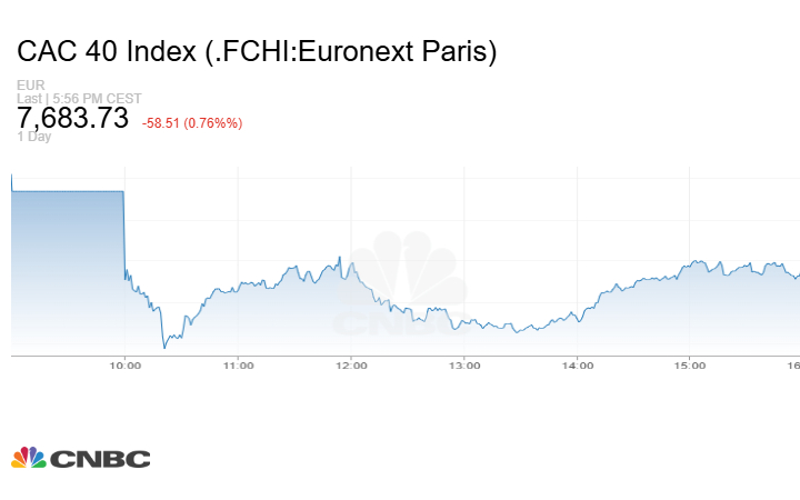 في حين تراجع مؤشر CAC 40 الفرنسي بنحو 58.51 نقطة أو بنسبة 0.76% عند الإغلاق إلى مستوى 7683.73 نقطة.