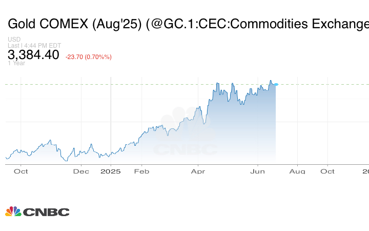 ولم يطرأ تغيير يذكر على الذهب في المعاملات الفورية وسجل 3369.63 دولار للأونصة ليصل إلى أدنى مستوى له منذ 12 يونيو/ حزيران. وانخفضت العقود الأميركية للآجلة للذهب 0.7% إلى 3384.50 دولار للأونصة.