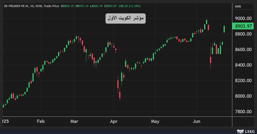 ارتفع مؤشر الكويت الأول بنسبة 2.4% في جلسة الثلاثاء ليغلق عند أعلى مستوى في أسبوعين ويعوض معظم خسائر الحرب الإسرائيلية الإيرانية بدعم من ارتفاع سهمي وطني وبيتك بأكثر من 2% لكل منهما.