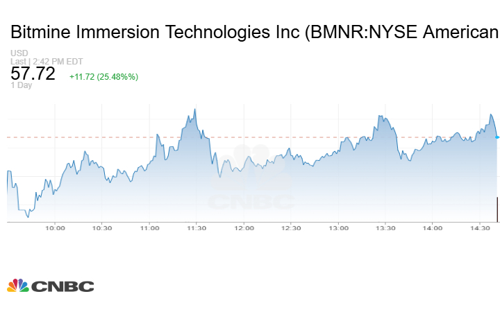 وقفز سهم BitMine Immersion Technologies، وهي شركة تعدين بتكوين أعلنت هذا الأسبوع عن خطط لجعل الإيثريوم احتياطيها الرئيسي من سندات الخزانة، بنحو 25%. وحقق السهم مكاسب تجاوزت 1000% منذ الإعلان.