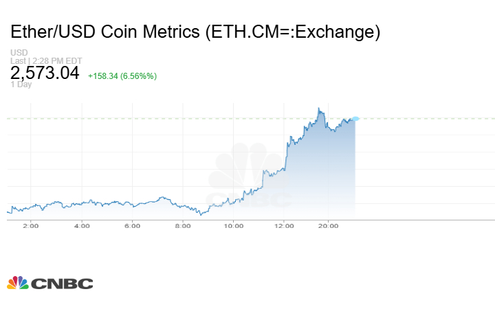 كما زادت عملة إيثريوم بأكثر من 6% خلال تعاملات آخر 24 ساعة إلى مستوى أعلى من 2570 دولاراً.