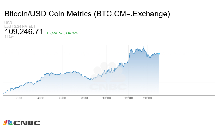 وارتفعت عملة بتكوين في تعاملات آخر 24 ساعة بأكثر من 3600 دولار أو بنحو 3.5% إلى مستوى يتجاوز 109 آلاف دولار.