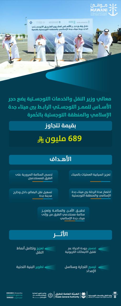 وضع وزير النقل والخدمات اللوجستية السعودي ورئيس مجلس إدارة الهيئة العامة للموانئ "موانئ"، صالح بن ناصر الجاسر، حجر الأساس للممر اللوجستي الرابط بين ميناء جدة الإسلامي والمنطقة اللوجستية بالخمرة بمدينة جدة.