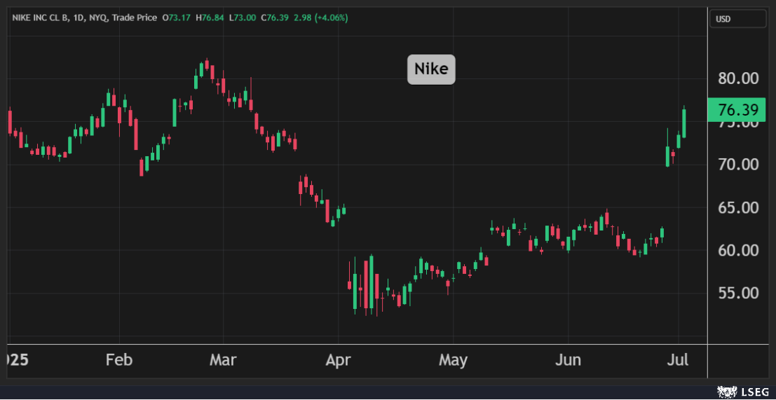 ارتفع سهم Nike بنسبة 4% في جلسة الأربعاء إلى أعلى مستوياته في نحو 4 أشهر.