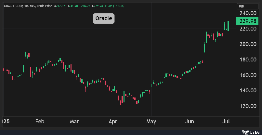 قفز سهم Oracle بنسبة 5% في جلسة الأربعاء ليغلق عند أعلى مستوياته على الإطلاق، وتضيف الشركة 31 مليار دولار إلى قيمتها السوقية في يوم واحد.