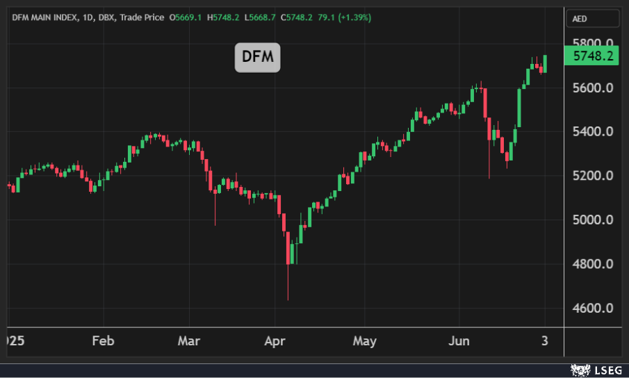 وفي سوق دبي، ارتفع المؤشر العام بنسبة 1.4% مسجلا أعلى مستوياته في 17 عاماً بدعم من ارتفاع جماعي للقياديات.