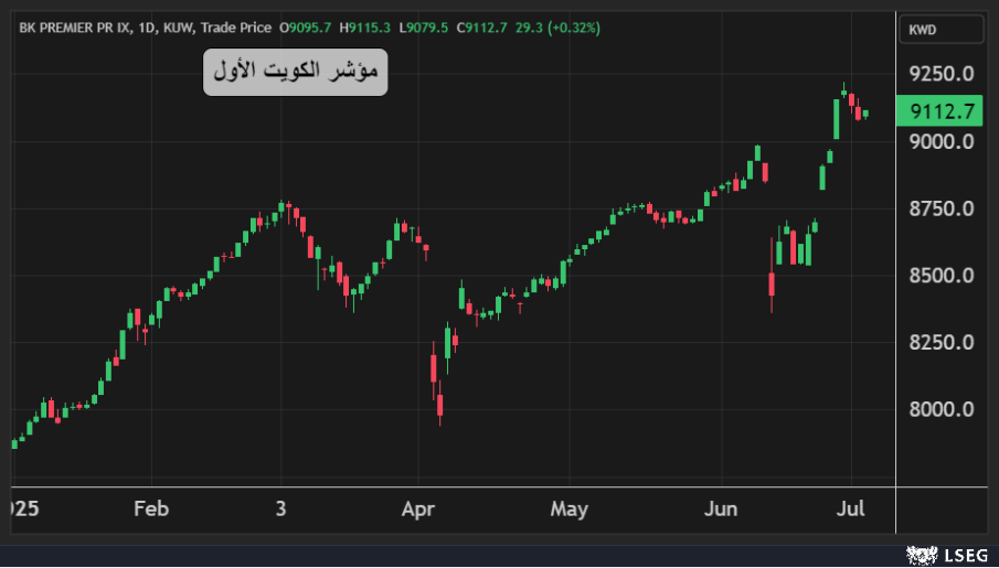 ارتفع مؤشر الكويت الأول بنسبة 0.3% في جلسة الخميس ليغلق فوق مستويات 9100 نقطة بدعم من ارتفاع سهمي زين وبيتك بنسبة 1.4% و0.4% على التوالي.