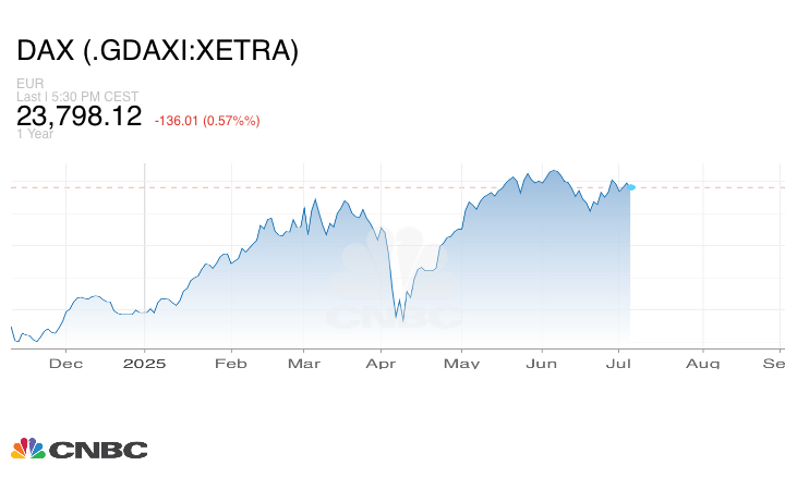 على صعيد البيانات الاقتصادية، أعلن مكتب الإحصاء الألماني، ديستاتيس، الجمعة أن طلبات التصنيع في ألمانيا انخفضت بنسبة 1.4% على أساس شهري في مايو، وهو ما يقل بكثير عن توقعات المحللين بانخفاض قدره 0.1% في استطلاع أجرته رويترز. وارتفعت الطلبات بنسبة 5.3% على أساس سنوي.