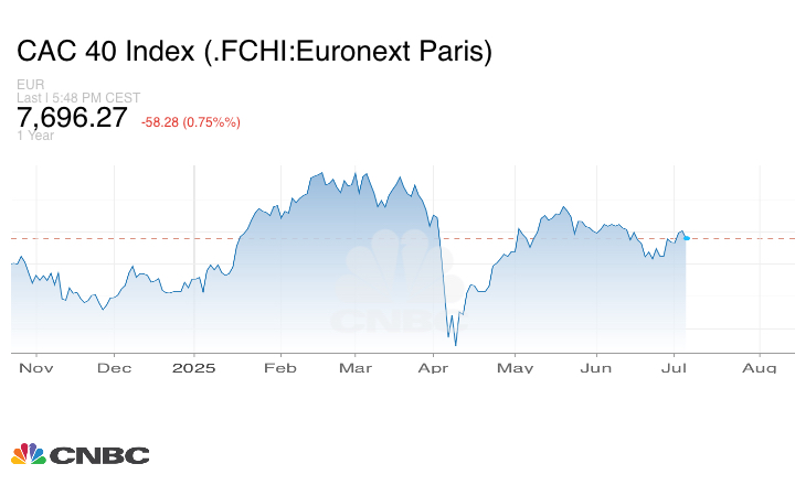 وانخفض مؤشر CAC 40 الفرنسي بنسبة 0.75%% إلى 7.696.27 نقطة.