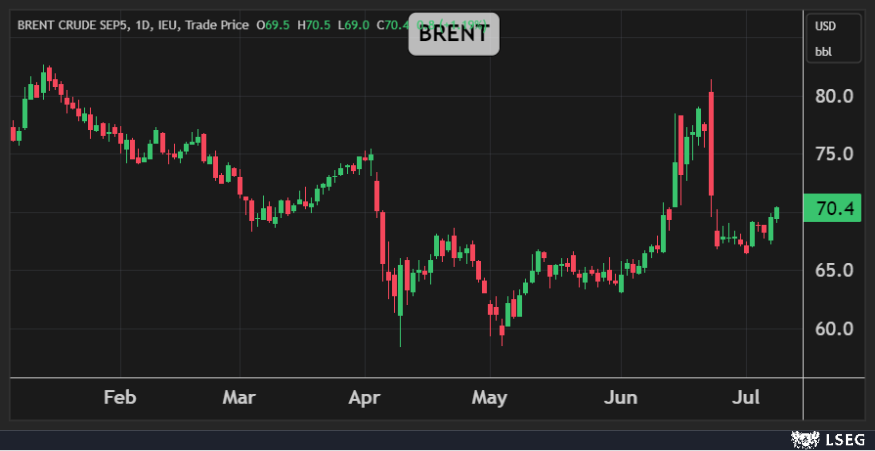 ارتفعت العقود الآجلة لخام برنت بأكثر من 1% خلال تعاملات الثلاثاء، لتتجاوز مستويات 70 دولاراً للبرميل لأول مرة منذ أكثر من أسبوعين، وذلك مع تقييم الأسواق لتداعيات تصعيد التوترات التجارية.