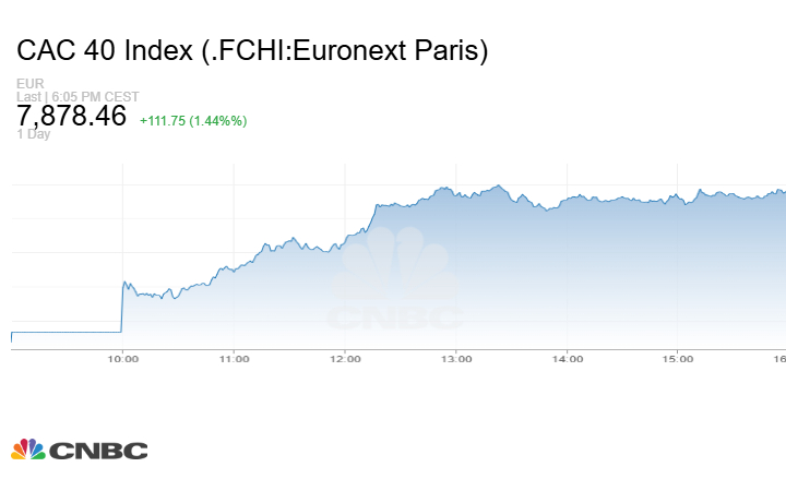 في حين زاد مؤشر CAC 40 الفرنسي بنحو 111.75 نقطة أو بنسبة 1.44% عند الإغلاق إلى مستوى 7878.46 نقطة.