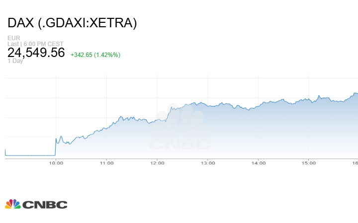 كما أغلق مؤشر DAX الألماني الجلسة على صعود 342.65 نقطة أو بنسبة 1.42% إلى مستوى 24549.56 نقطة.