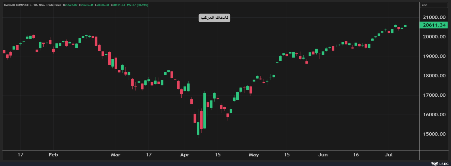 وارتفع مؤشر ناسداك المركب بنسبة 0.9% مسجلاً إغلاقاً قياسياً جديداً عند مستويات 20611 نقطة.