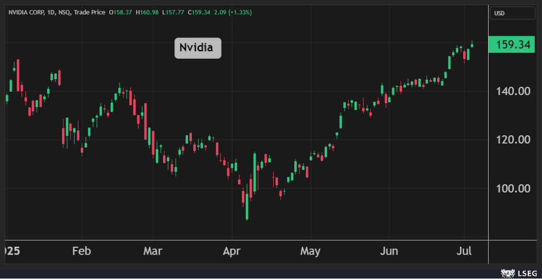 وأصبحت Nvidia أول شركة في العالم تصل قيمتها السوقية إلى 4 تريليونات دولار في بداية جلسة الأربعاء عندما وصلت مكاسب السهم لأكثر من 2.5%.
