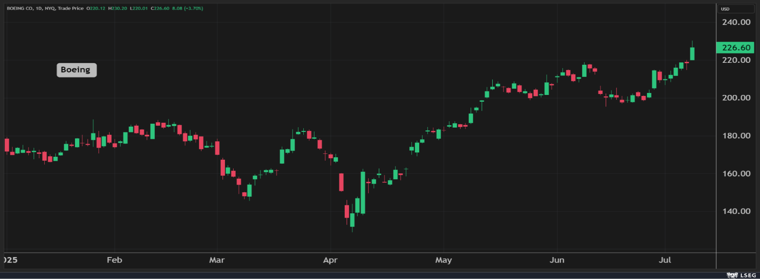 وجاءت هذه المكاسب بدعم من رفع Susquehanna السعر المستهدف للسهم إلى 252 دولاراً من 240 دولاراً بعد أن أعلنت شركة صناعة الطائرات يوم الثلاثاء أن تسليمات طائراتها في يونيو زادت بنسبة 27% على أساس سنوي.