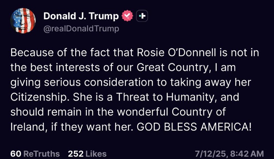 كتب ترامب على منصة تروث سوشيال "نظراً لأن تصرف روزي أودونيل ليس في مصلحة بلدنا العظيم، فإنني أفكر جدياً في سحب جنسيتها"، مستحضراً مبدأ الترحيل الذي تلجأ إليه الإدارة الأميركية عند محاولات إبعاد محتجين مولودين في الخارج عن البلاد.