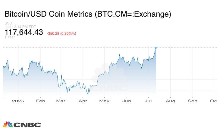 تراجعت عملة البتكوين المشفرة بشكل طفيف، يوم السبت 12 يوليو/ تموز، بشكل طفيف بنسبة 0.39% إلى 117.540.00 دولار، بعد يوم من وصولها إلى قمة تاريخية تجاوزت 118 ألف دولار، وسط ترقب أسبوع العملات المشفرة في الكونغرس.