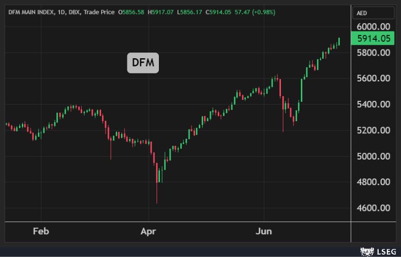 وفي سوق دبي، ارتفع المؤشر العام بنسبة 1% ليغلق فوق مستويات 5900 نقطة لأول مرة في 17 عاماً بدعم من قفزة بسهم الإمارات دبي الوطني بنسبة 5% لأعلى مستوياته على الإطلاق.